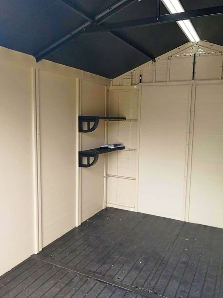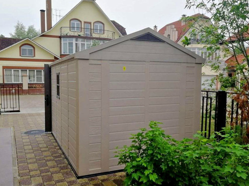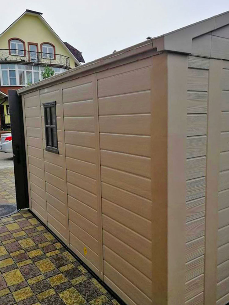 Сарай из высококачественного пластика, не подвержен деформации и устойчив в условиях высокой ветренности, жары и высокой влажности. В конструкции используются стальные стержни, что усиливает конструкцию, а прочный и плотный пластика не дает деформироваться конструкции.